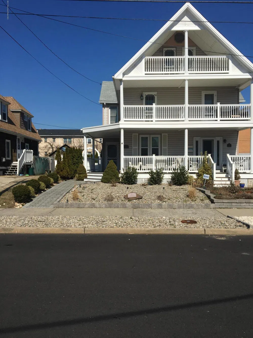 Ocean block beach home with wrap around porch and ocean views and no maintenance home steps from the ocean. Incredible Ocean views on south facing balconies. Four bedrooms and two bath and laundry room.Custom staircase and tankless furnace/water heater just to name a few unique features. Large outside landscaped space with all pavers, vinyl fencing, outdoor shower, BBQ, dining al fresco, and seating arrangement and full bar with refrig and sink, Walking distance to restaurants and shopping. Music on the boardwalk nightly and miniature golf. Memories that will last a lifetime. Great investment for your beach home or to be a rental with no downtime. Sold fully furnished.DRIVEWAY APPROVAL!!!!